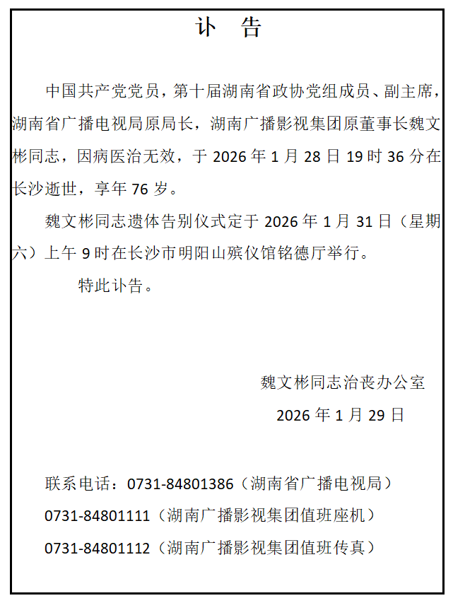 中国共产党党员,第十届湖南省政协党组成员、副主席,湖南省广播电视局原局长,湖南广播影视集团原董事长魏文彬同志,因病医治无效,于2026年1月28日19时36分在长沙逝世,享年76岁。